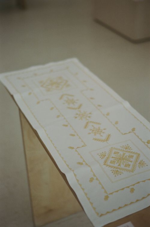 The "karsaniko" stitch originated from the small village, Karia, on the island of Lefkada where we sourced this collection from. It's a front & back stitch that appears the same on both sides, so either side can be considered the "front." It takes a great level of skill and mastery to create a piece like this. This table runner has beautiful gold threading that highlight the intricate details of the embroidery. A special statement piece that's sure to inspire and connect you to the hands that made it.